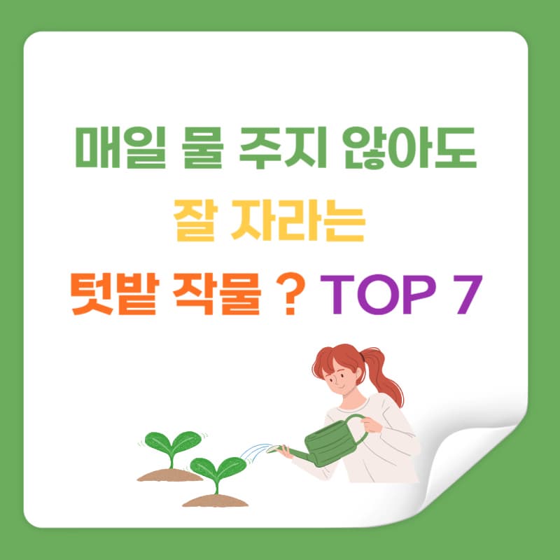 텃밭을 가꾸고 싶은 마음은 굴뚝같지만,매일 아침마다 물 주는 일이 부담스러우셨나요?특히 직장인이나 주말농장을 운영하는 분들이라면매일같이 물 주기란 생각보다 쉽지 않은 일입니다.하지만 걱정하지 마세요.자주 물을 주지 않아도 건강하게 자라는 튼튼한 작물들이 있습니다!오늘은**매일 물 주지 않아도 잘 자라는 작물 TOP 7**과수분 관리 꿀팁까지 함께 소개해드릴게요.시간은 줄이고, 수확은 늘릴 수 있는 작물들입니다! 🥬 1. 상추 – 의외로 건조에 강한 다년초상추는 수분을 좋아하는 작물로 알려져 있지만,반그늘 환경에서 키우면생각보다 적은 물로도 충분히 잘 자라는 작물입니다.✔️ 텃밭 팁:뿌리 주변에 짚, 부직포, 비닐 등으로 멀칭을 해주면수분 증발이 줄어들어 격일로만 물을 줘도 충분합니다. 🧄 2. 마늘 ..